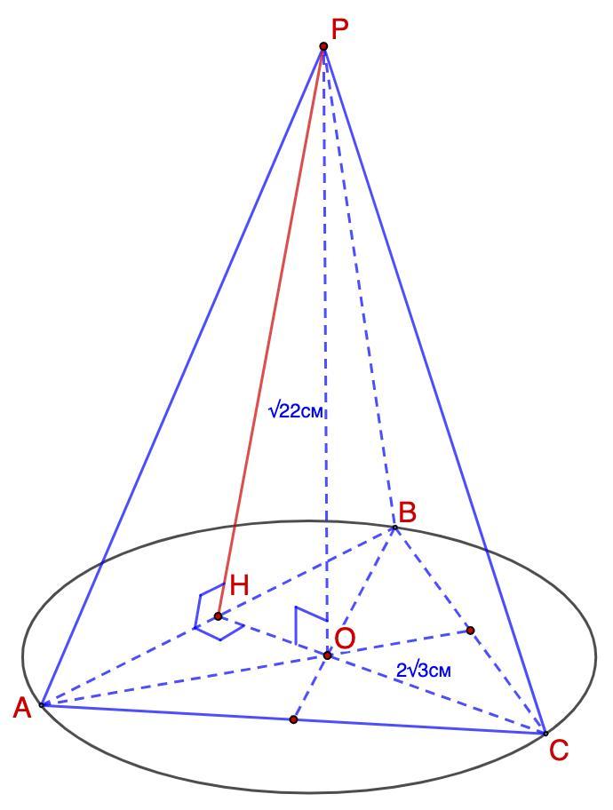 Найдите площадь боковой поверхности правильной треугольной пирамиды, у которой радиус окружности, описанной около основания, равен 2√3 см, а отрезок, соединяющий вершину пирамиды с центром основания, равен √22 см.