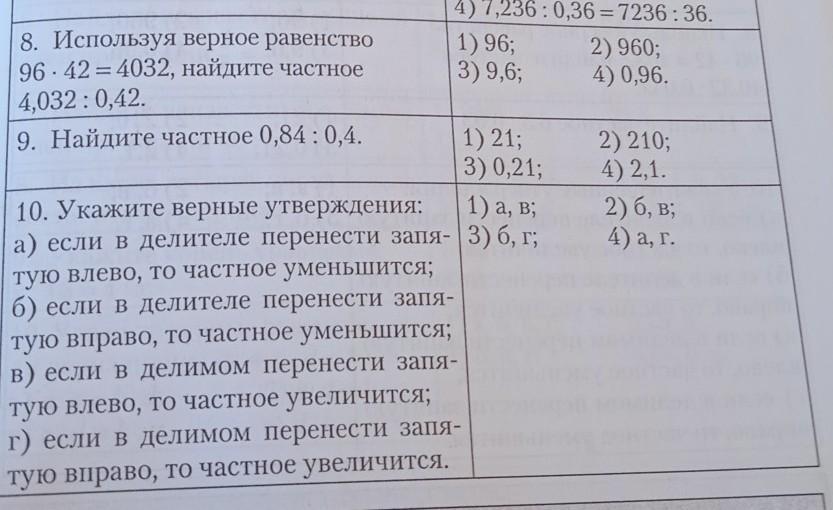 8. Используя верное равенство |96 - 42 = 4032, найдите частное 4,032: 0,42. 9. Найдите частное 0,84 : 0,4. 10. Укажите верные утверждения: a) если в делителе перенести запя- тую влево, то частное уменьшится; б) если в делителе перенести запя- тую вправо, то частное уменьшится; в) если в делимом перенести запя- тую влево, то частное увеличится; г) если в делимом перенести запя- тую вправо, то частное увеличится. 1) 96; 3) 9,6; 1) 21; 3) 0,21; 1) а, в; 3) б, г; 2) 960; 4) 0,96. 2) 210; 4) 2,1. 2) б, в; 4) а, г.