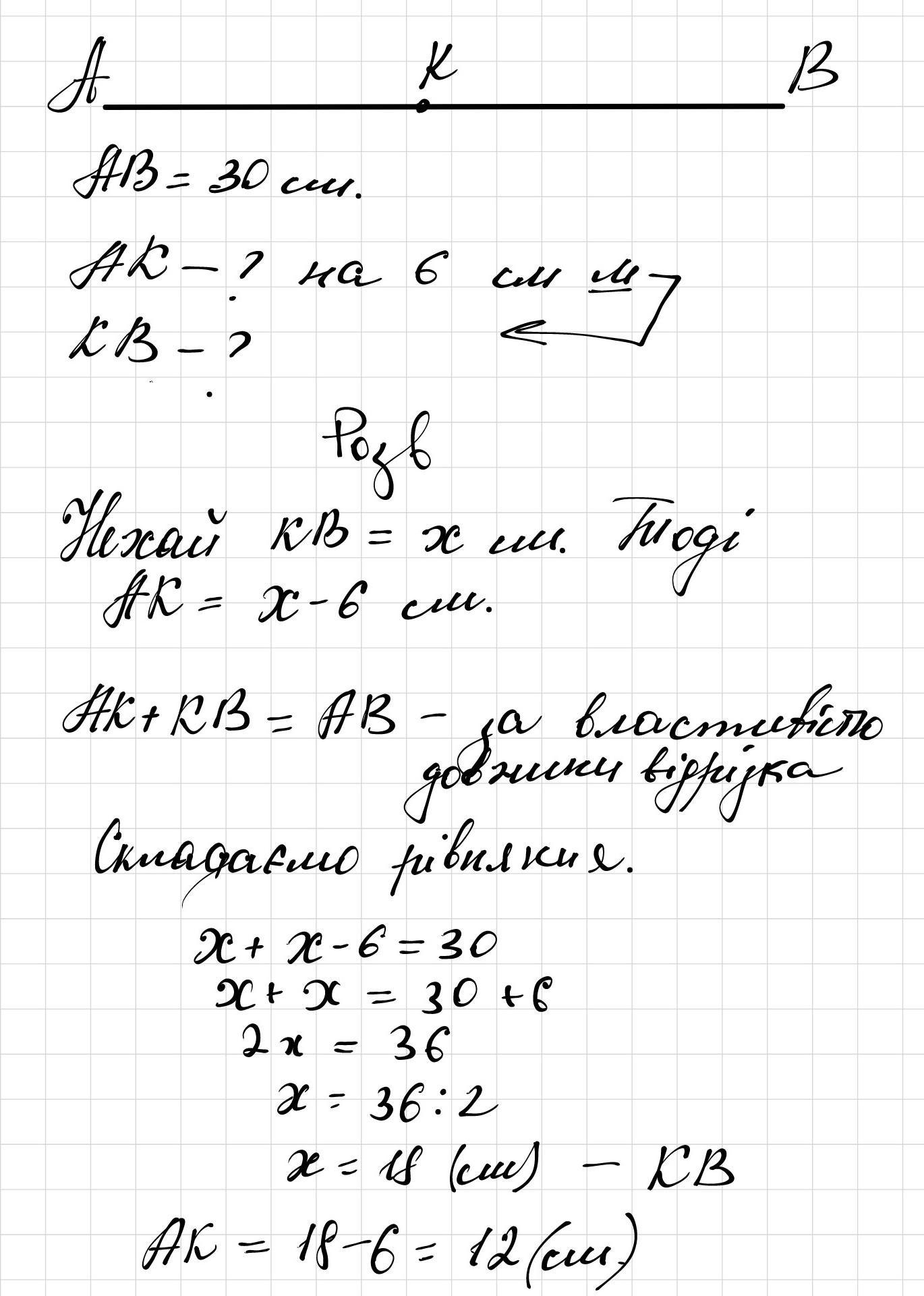 на відрізку АВ довжиною 30 см взято точку К . Знайдіть довжину відрізка АК та ВК якщо АК менший від ВК на 6 см