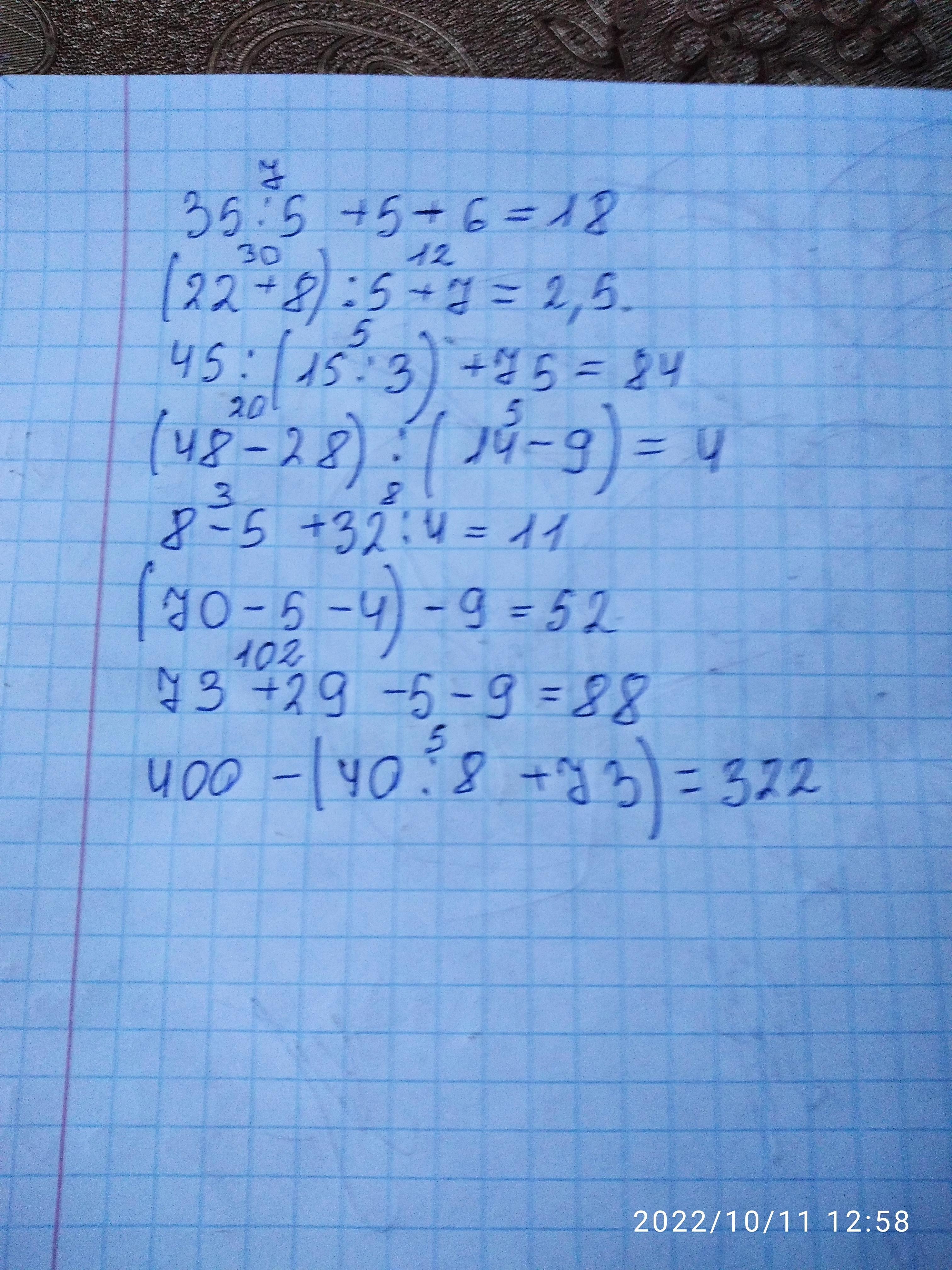 9. Прочитай выражения. Найди их значения 35:5+5-6, (22+8): 5+7, 45: (15:3)+75, (48-28): (14-9) ,8-5+32:4, (70-5-4)-9, 73+29-5-9 ,400-(40:8 +73)