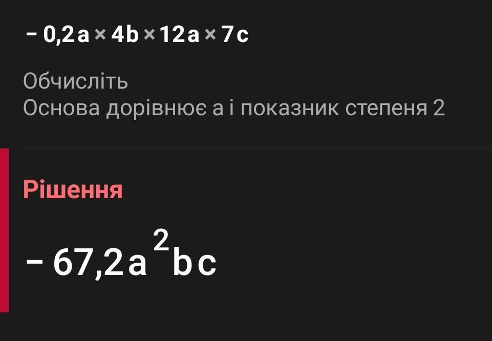 Зведи одночлен −0,2a4b⋅12a7c до стандартного вигляду і назви його коефіцієнт