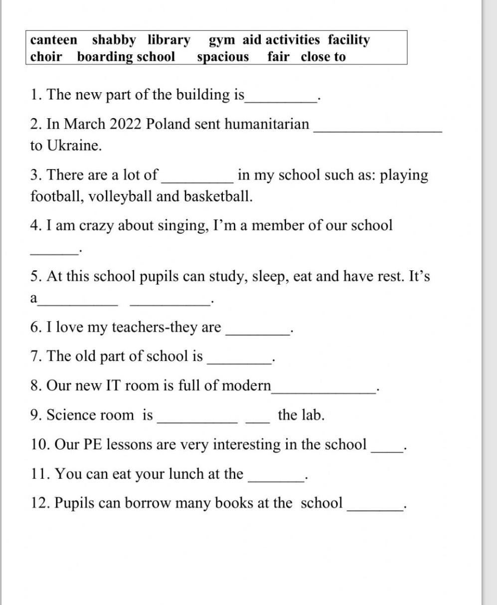 1. spacious 2. aid 3. activities 4. choir 5. boarding school 6. fair 7. shabby 8. facility 9. close to 10. gym 11. canteen 12. library