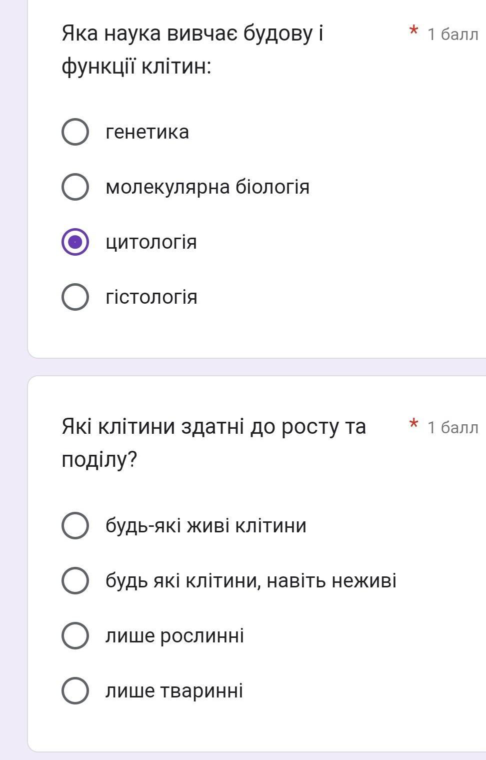 Яка наука вивчає будову і функції клітин: О генетика О молекулярна біологія Цитологiя О гістологія Які клітини здатні до росту та подiлу? О будь-які живі клітини будь які клітини, навіть неживі лише рослинні лише тваринні * 1 балл * 1 балл