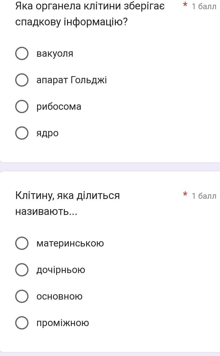 Яка органела клітини зберігає спадкову інформацію? о вакуоля апарат Гольджі о рибосома ядро Клітину, яка ділиться називають... материнською о дочірньою о основною О проміжною * * 1 балл 1 балл
