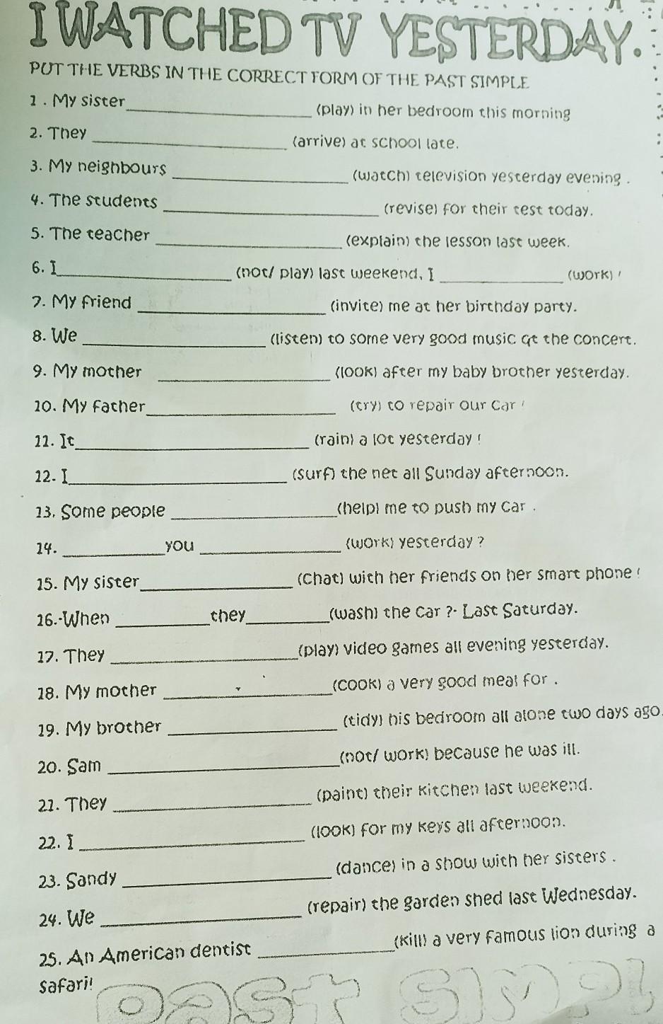 1.My sister played ... 2.They arrived ... 3.My neighbors watched ... 4.The students revised ... 5.The teacher explained 6.I didn't play last week. I worked. 7.My friend invited me... 8. We listened to... 9.My mother looked after... 10. My father tried to ... 11.It rained a lot... 12. I surfed the net ... 13.Some people helped me... 14. Did you work yesterday? 15. My sister chatted with ...16.When did they wash the car? 17.They played a video... 18.My mother cooked a very... 19. My brother tidied his... 20.Sam didn't work... 21.They painted their... 22.I looked for my keys all... 23.Sandy danced in a ... 24.We repaired the... 25.An American dentist killed a ...