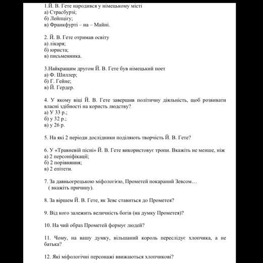 5. Творчість Й. В. Гете поділяють на такі 2 періоди: ранній (або штюрмерський) і веймарськи (або період вей-марського класицизму).
