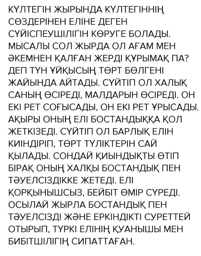 күлтегін жырында тәуелсіздік жолындағы Күлтегіннің ерлік іс-әрекеттерін өзіндік көзқарас тұрғысынан дамытып жаз.