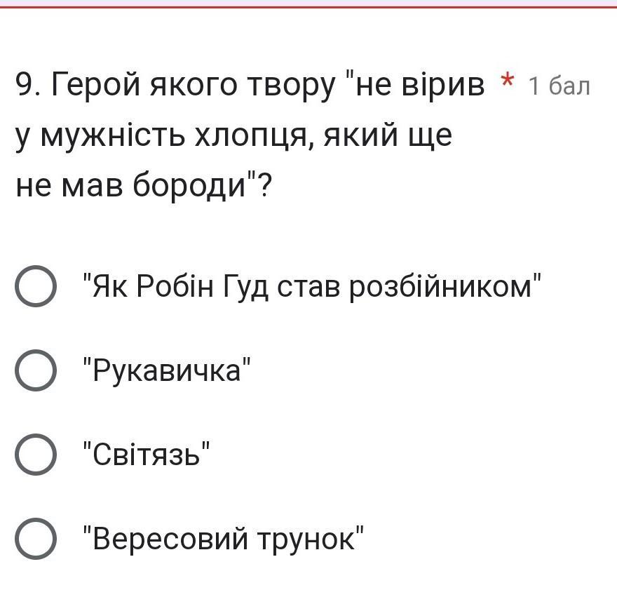 9. Герой якого твору "не вірив * 1 бал у мужність хлопця, який ще не мав бороди"? О "Як Робін Гуд став розбійником" о "Рукавичка" о "Світязь" О "Вересовий трунок"Пожалуста срочно надо!!!!