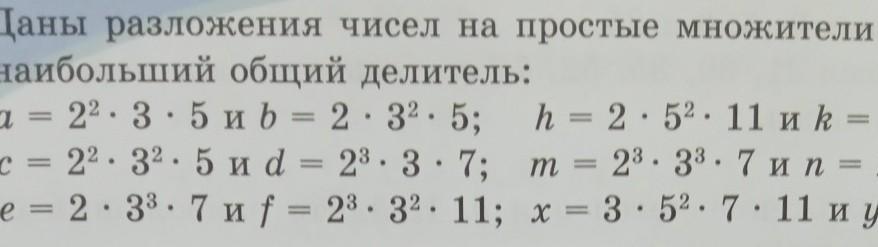 больший общий делитель: 22 . 3 . 5 и b = 2 · 2. 32 · 5; = 22 . 32 . 5 и d = 23 · 3 · 7; m = 23 . 33 . 7 и n = 23. 3 · 11; - паидите их h = 2 · 52. 11 и k = 23 . 53 . 13; = = 2 3³.7 и f = 2³. 32. 11; x = 3·5² . 52. 711 и y = 2³. у 32 данных чисел составьте пары взаимно простых чисел 3².5².