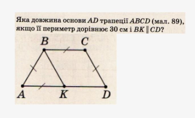 Яка довжина основи AD трапеції ABCD (мал. 89), якщо її периметр дорівнює 30 см i BK || CD? В с А K D