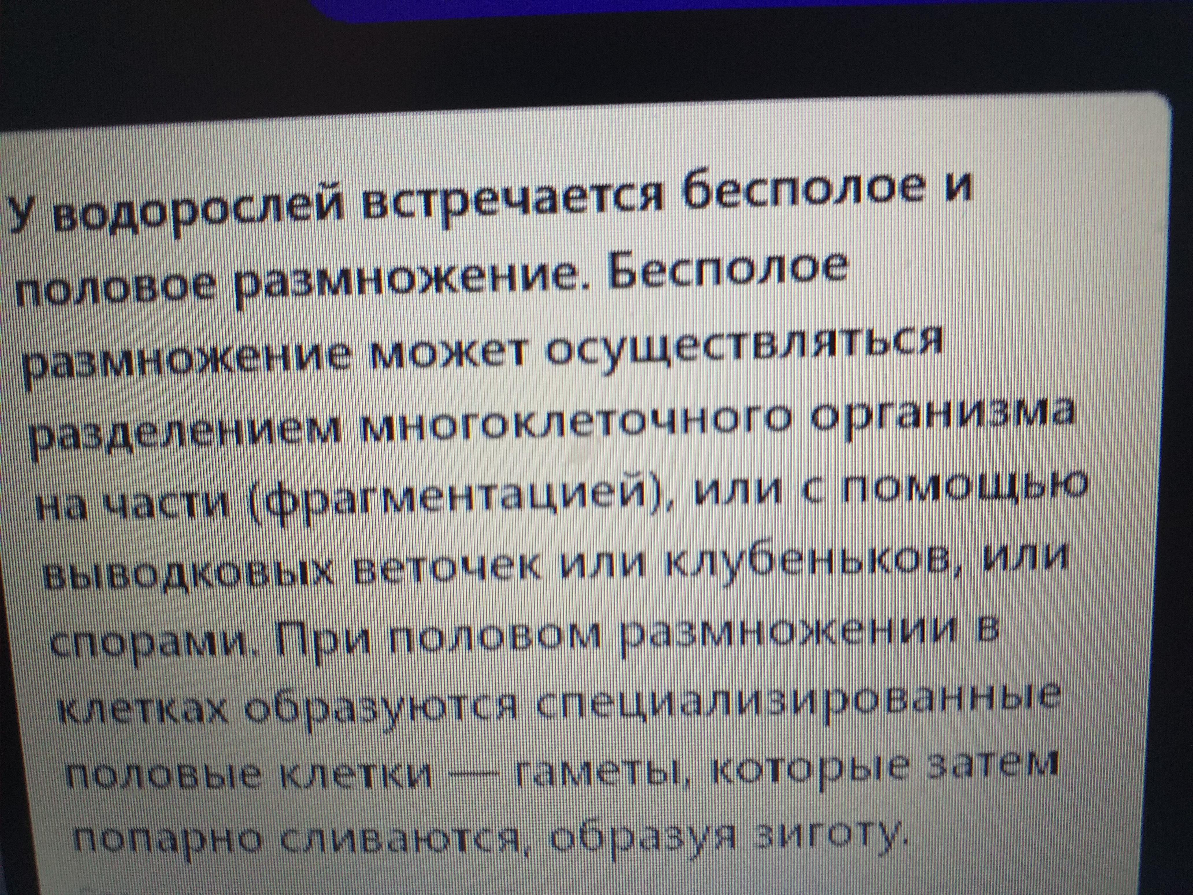 У водорослей есть несколько вариантов полового процесса: изогамия — слияние двух одинаковых по форме и размеру подвижных гамет; гетерогамия — слияние двух подвижных гамет, одинаковых по форме, но разных по размеру; оогамия — слияние крупной неподвижной яйцеклетки с мелким подвижным сперматозоидом.