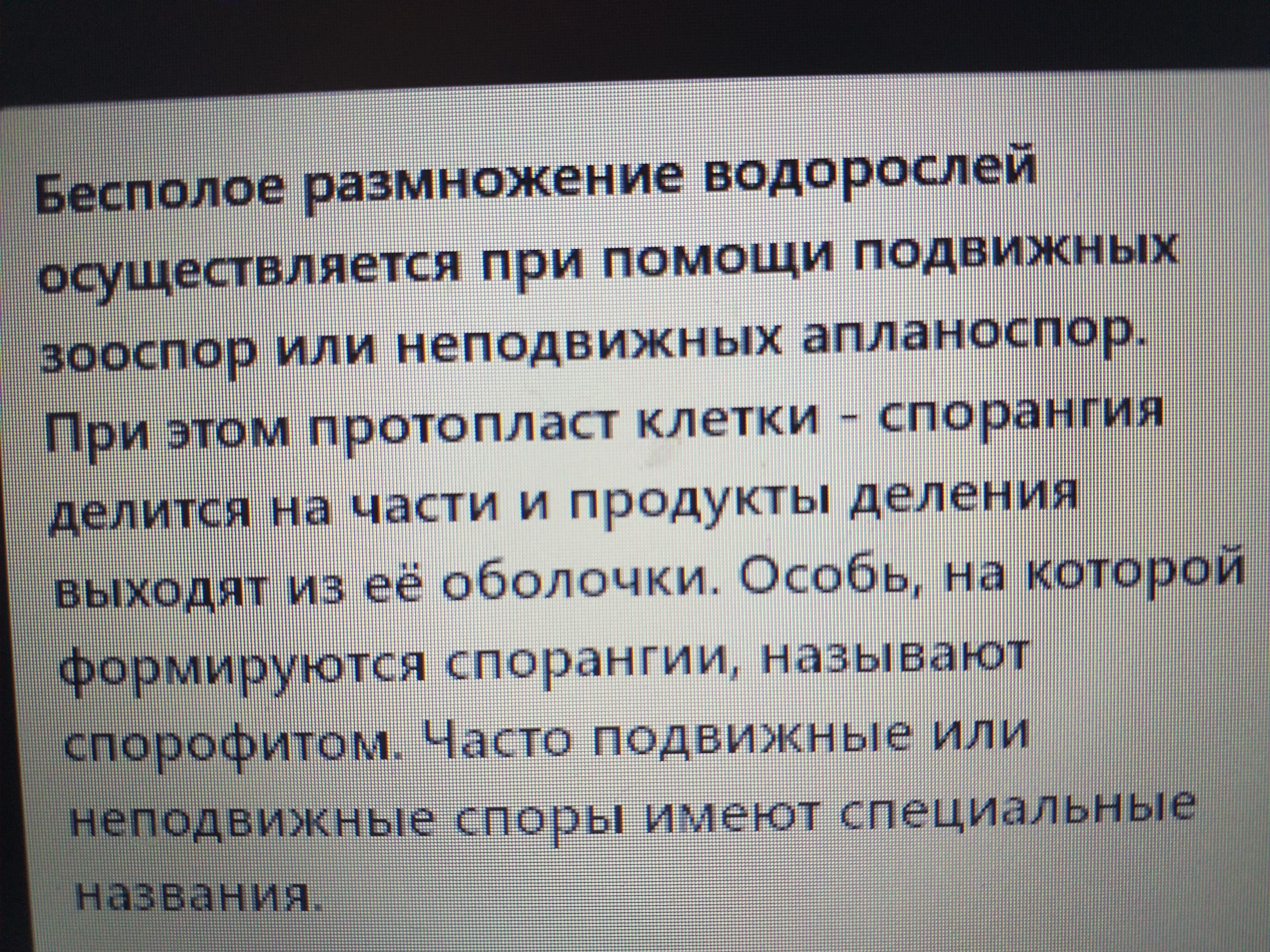 Бесполое размножение у водорослей осуществляется с помощью подвижных (зооспоры) и неподвижных (апланоспоры) спор. Спорообразование обычно сопровождается делением протопласта на части и выходом продуктов деления из оболочки материнской клетки.