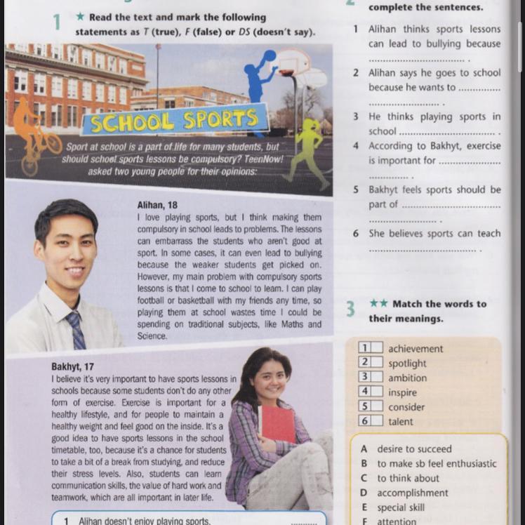 True/ False/ Doesnt Say1 Alihan doesn't enjoy playing sports.