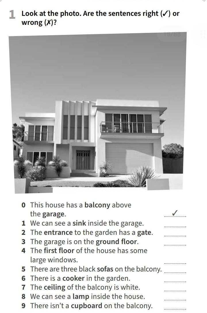 1 Look at the photo. Are the sentences right (✓) or wrong (X)? 0 This house has a balcony above the garage. 1 We can see a sink inside the garage. 2 The entrance to the garden has a gate. 3 The garage is on the ground floor. 4 The first floor of the house has some large windows. 5 There are three black sofas on the balcony. 6 There is a cooker in the garden. 7 The ceiling of the balcony is white. 8 We can see a lamp inside the house. 9 There isn't a cupboard on the balcony.