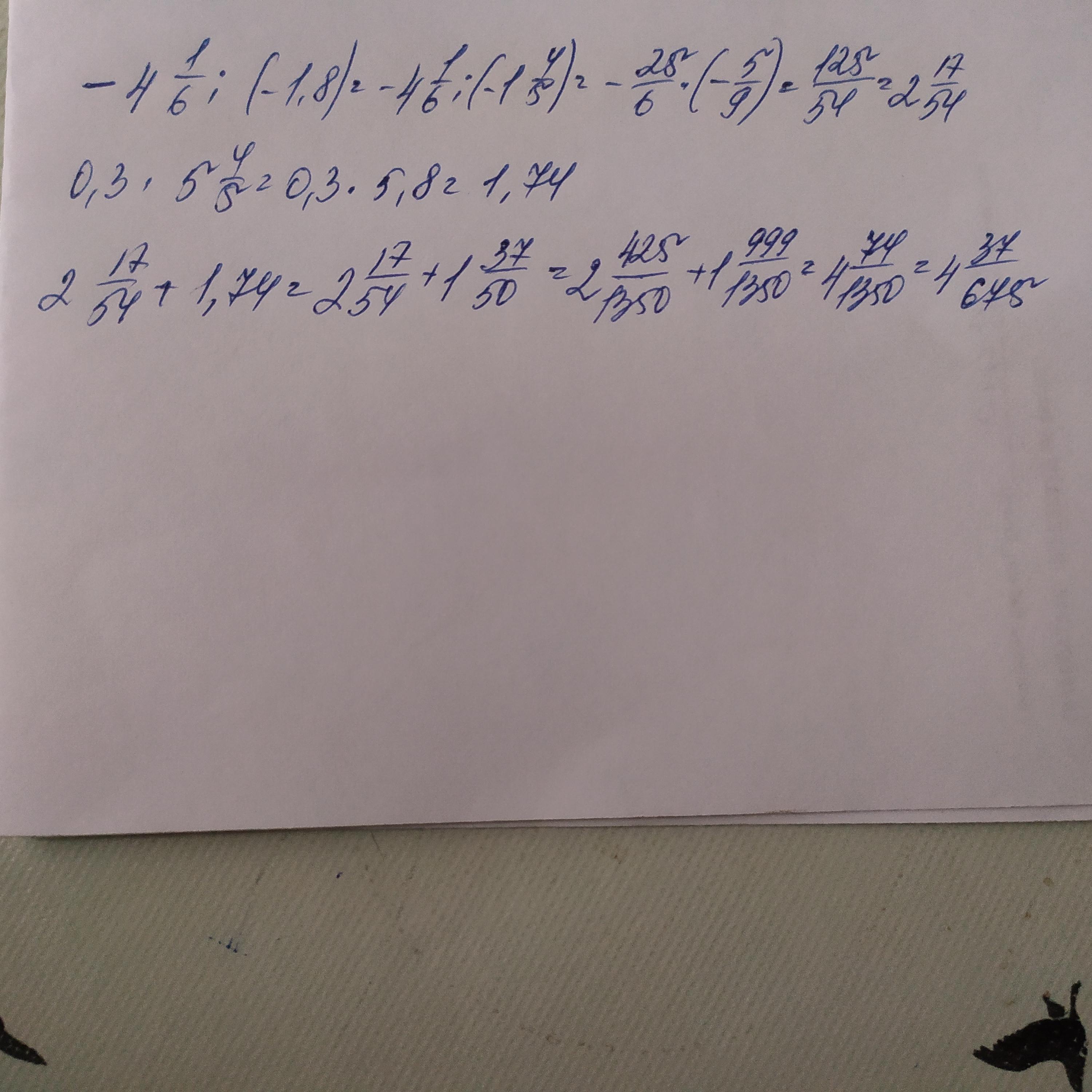 Знайдіть значення виразу:-4 1/6:(-1,8)+0,3•5 4/5