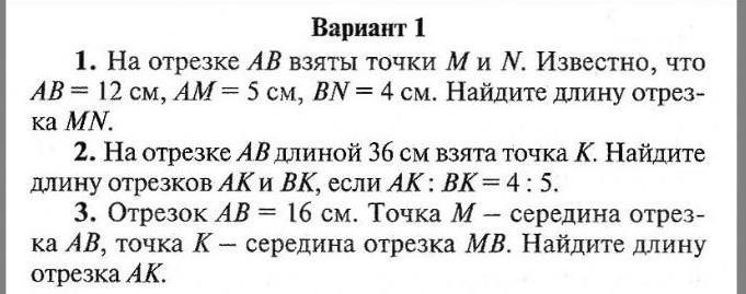 1. На отрезке АВ взяты точки М и N. Известно, что AB = 12 см, AM=5 cm, BN = 4 см. Найдите длину отрез- ka MN. 2. На отрезке АВ длиной 36 см взята точка К. Найдите длину отрезков АК и ВК, если АК: ВК= 4 : 5. 3. Отрезок AB = 16 см. Точка М- 16 см. Точка М - середина отрез- = ка АВ, точка К- середина отрезка МВ. Найдите длину отрезка АК.