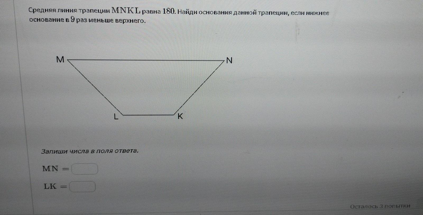 Обозначим нижнее основание как х. а верхнее как 9х, тогда: