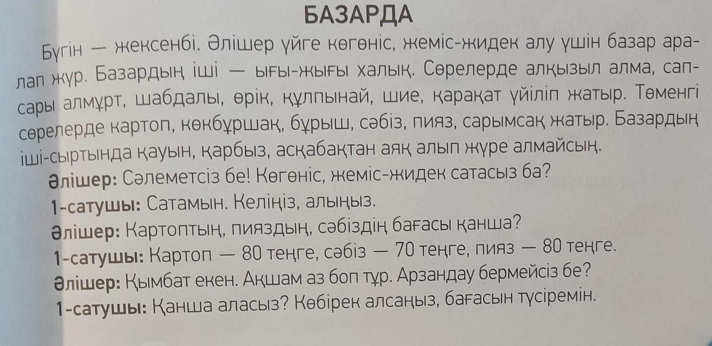 6 тапсырма.мәтінді тыңда.сұрақтарға жауап бер.-адамдар базарға не үшін барады?-сен жеміс-жидектен нені жақсы көресің?-не себепті?-жеміс-жидектің адам денсаулығына пайдасы туралы білесің бе?