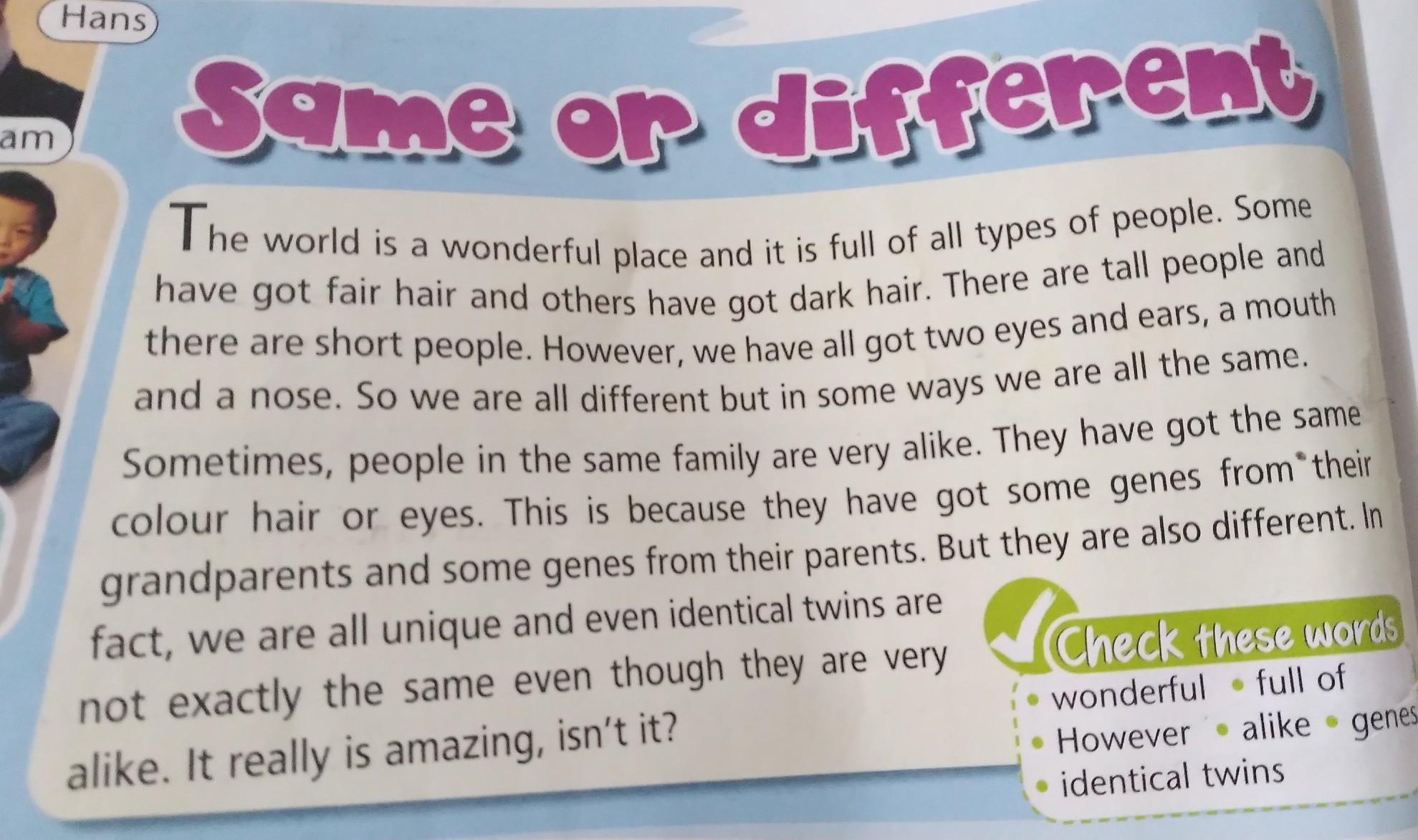 ans 2 1 2 3 4 5.R6 Listen and read the text. Ma T (true), F (false) or DS (doesn't say). Most people have dark hair. All people have got common features. People in the same family are alike. Identical twins are not the same. пж помогите дам все баллы!!! вот и текст есть