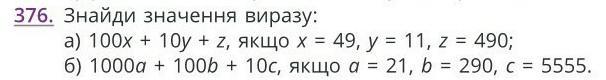 Знайди значення виразу: a) 100x + 10y + z, якщо x = 49, y = 11, z = 490; 6) 1000a + 100ь + 10с, якщо а = 21, b = 290, c = 5555.