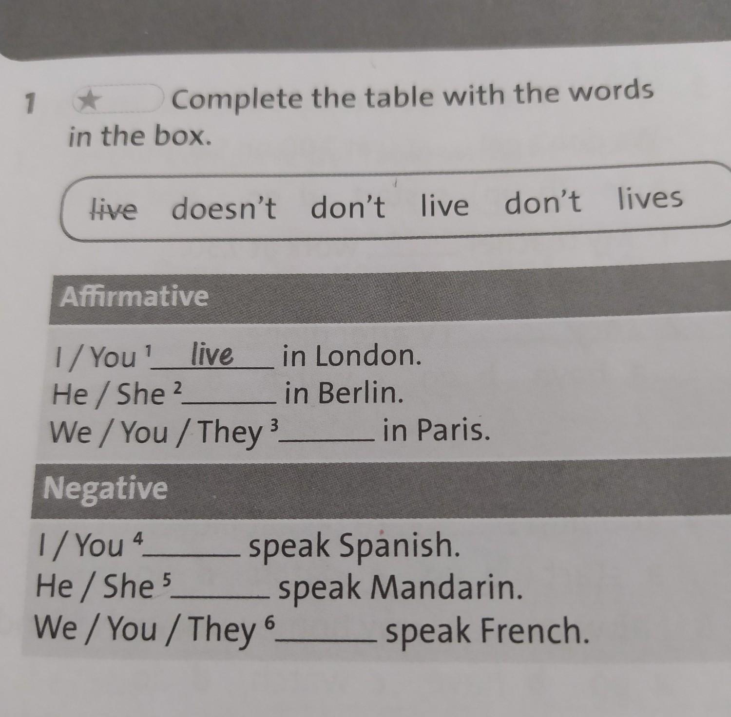 ords 1 Complete the table with the words in the box. live doesn't don't live don't lives Affirmative 1/You¹ live in London. He/She 2 in Berlin. 3 We / You / They ³. Negative 1/You 4 He/She 5 We / You / They 6 in Paris. speak Spanish. speak Mandarin. speak French. O 3