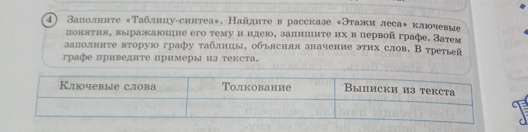 Заполните Таблицу-синтез». Найдите в рассказе «Этажи леса» ключевые понятия, выражающие его тему и идею, запишите их в первой графе. Затем заполните вторую графу таблицы, объясняя значение этих слов. В третьей графе приведите примеры из текста. Ключевые слова Поговорим поспори Толкование Выписки из текста OBL