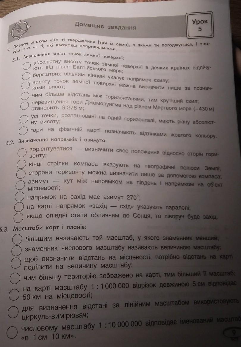 5. Познач знаком «+» тi твердження (три iз семи), тi, якi вважаеш неправильними. 5.1. Визначення висот точок земної поверхнi: КОМ 1-3) з якими ти погоджуєшся, і зна- абсолютну висоту точок земної поверхні в деяких країнах вiдлiчу- ЮТЬ ВІД Рiвня Балтійського моря: бергштрих вільним кінцем указує напрямок схилу; висоту точок земної поверхні можна визначити лише за познач- ками висот; чим більша відстань між горизонталями, тим крутіший схил; перевищення гори Джомолунгма над рівнем Мертвого моря (-430 м) становить 9 278 м; усi точки, розташовані на одній горизонталi, мають різну абсолют- ну висоту; О гори на фізичній карті позначають відтінками жовтого клу