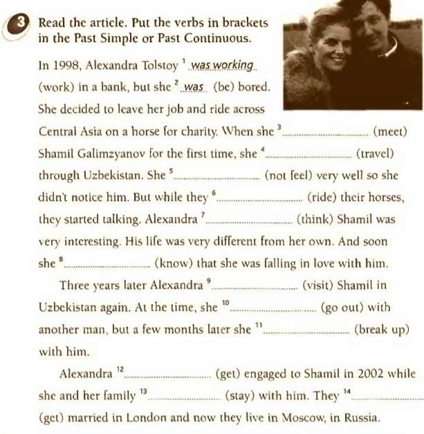 In 1998, Alexandra Tolstoy' was working. (work) in a bank, but she was (be) bored. She decided to leave her job and ride across Central Asia on a horse for charity. When she Shamil Galimzyanov for the first time, she ". (meet) (travel) they started talking. Alexandra'. ...... (think) Shamil was