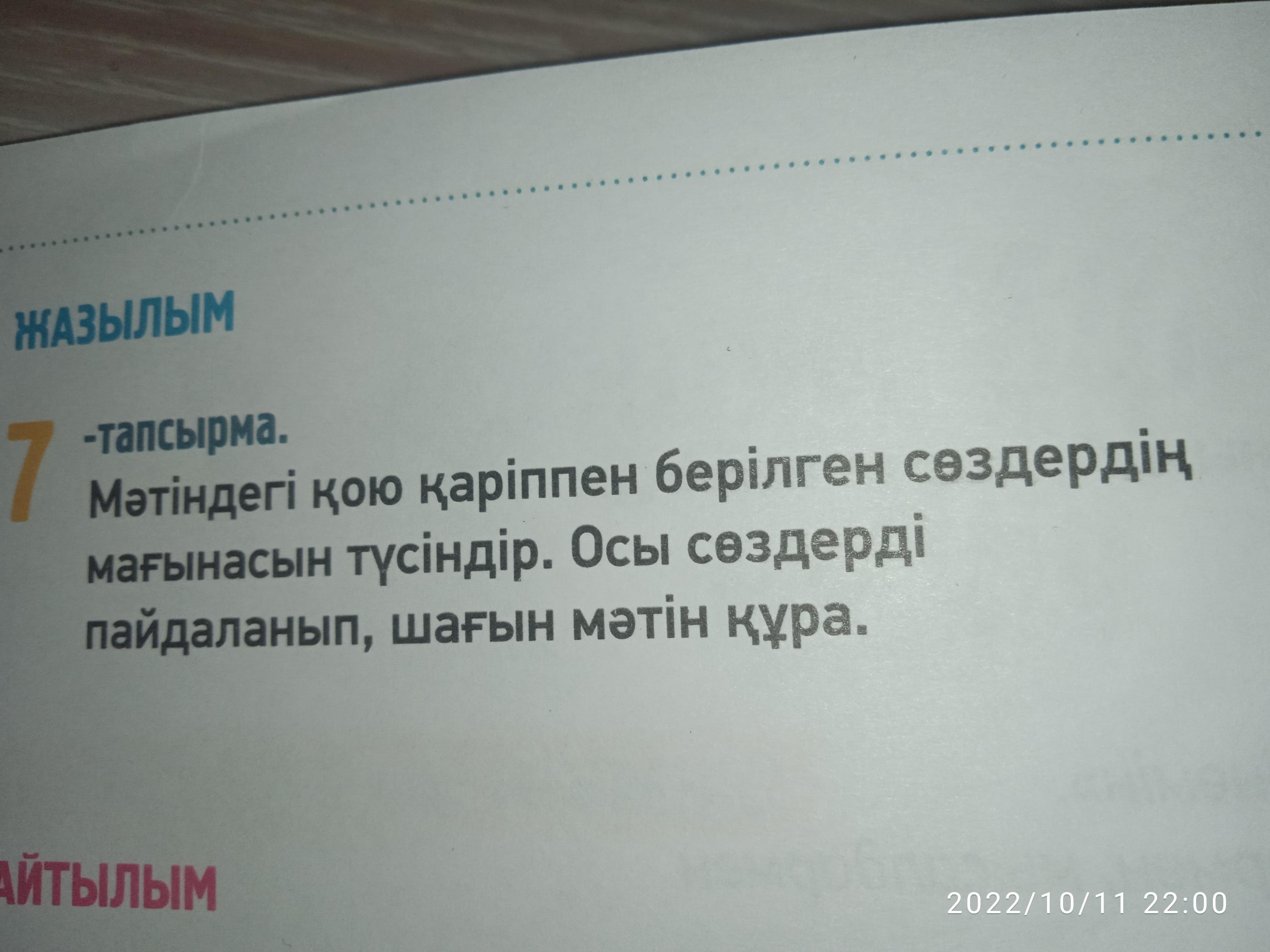 Мәтіндегі қою қаріппен берілген сөздердің мағынасын түсіндір.Осы сөздерді пайдаланып,шығын мәтін кұра.10 это для 7 задания