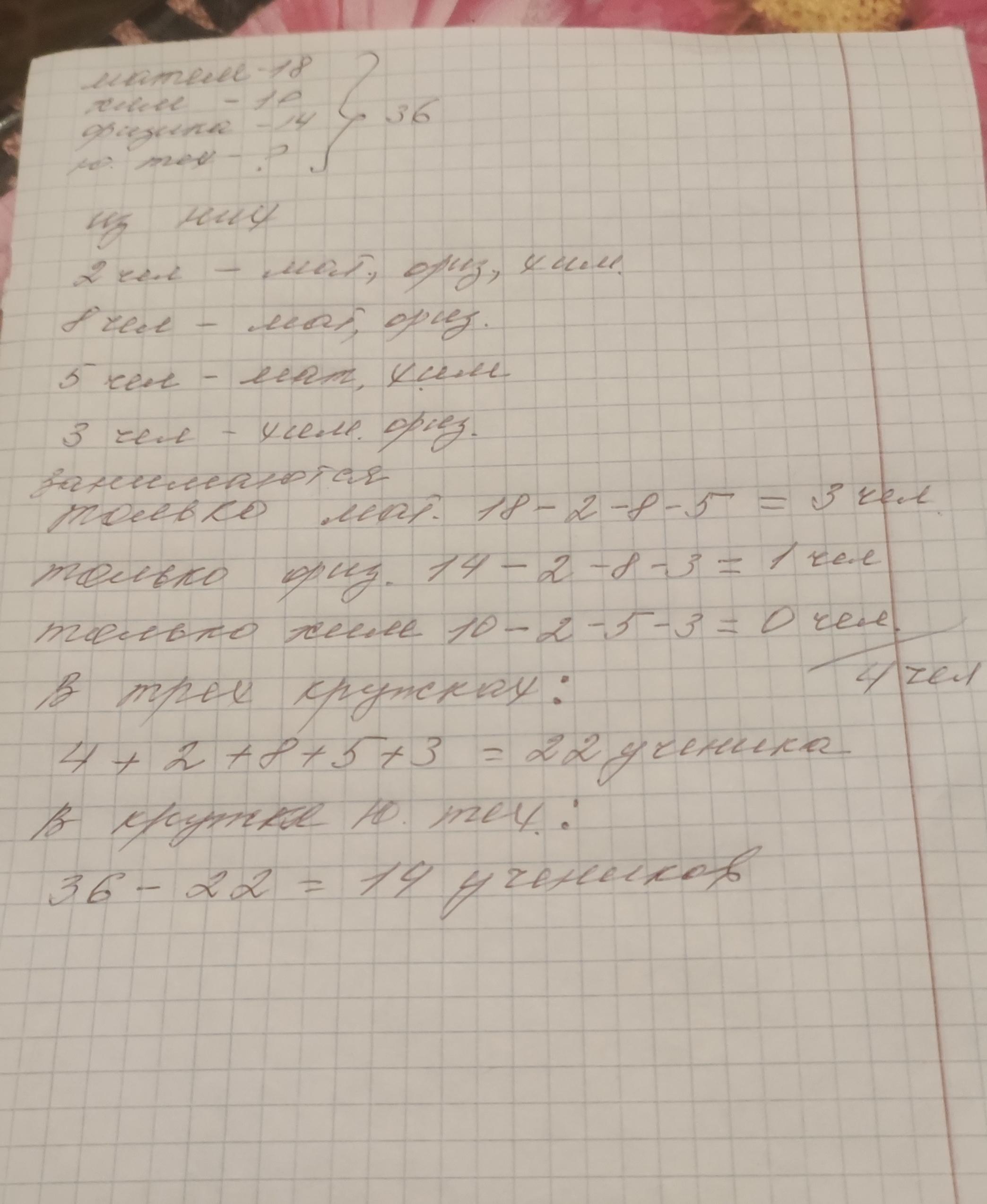 Задача : Ребята посещают 3 кружка . Математика , химия и физика . Решено было организовать кружок юных техников и пригласить тех ребят , которые не занимались ни в одном кружке . Сколько таких ребят ? Если всего в классе 36 человек . математикой занимаются - 18 чел , физикой - 14 чел , химией - 10 человек . 2 - занимаются на всех трёх кружках . 8 чел - мат и физ , 5 - мат и химия , 3 - химия и физика .