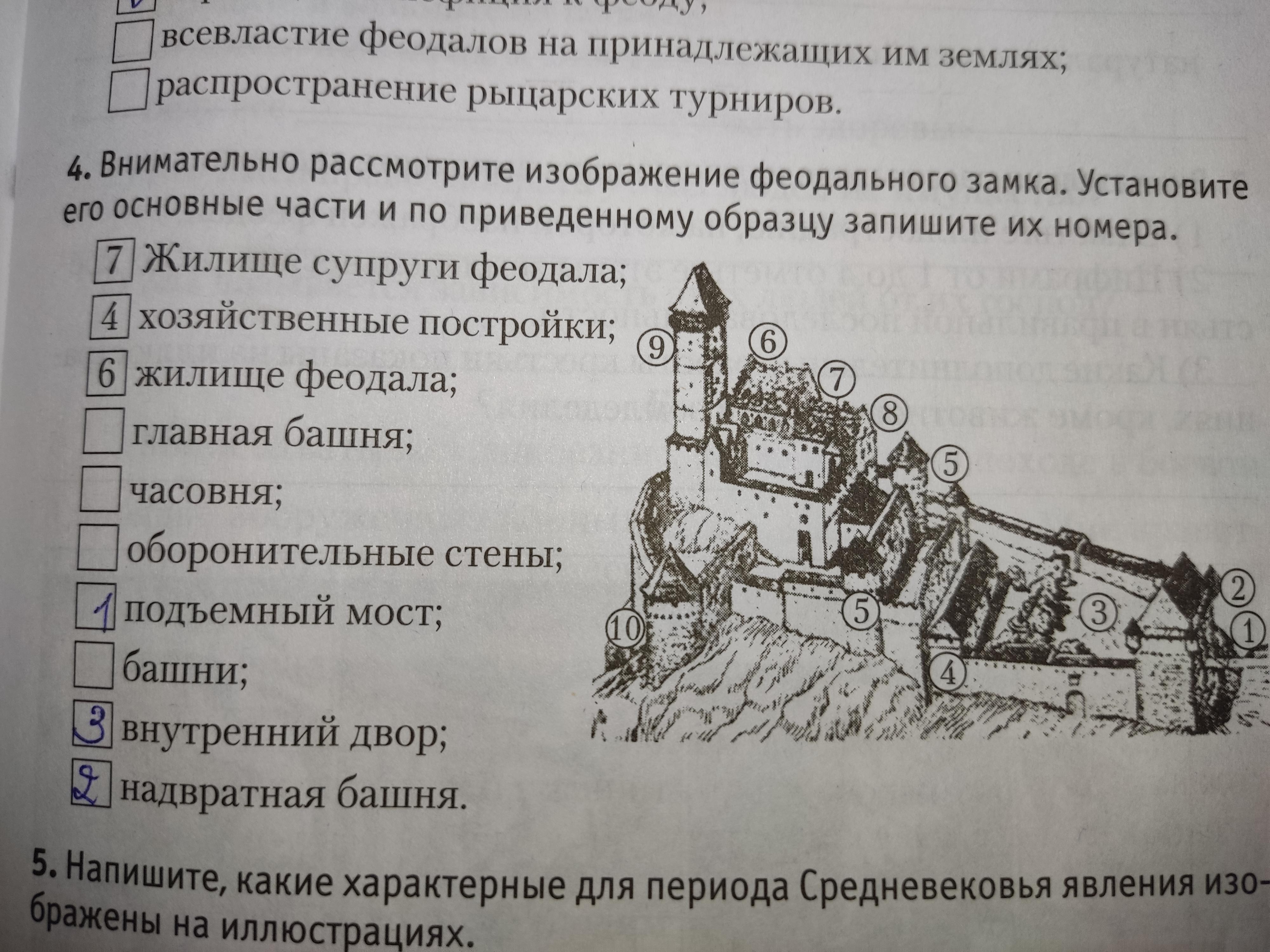 главная башня - 9 ; часовня - 8 ; оборонительные стены - 5 ; башни - 10