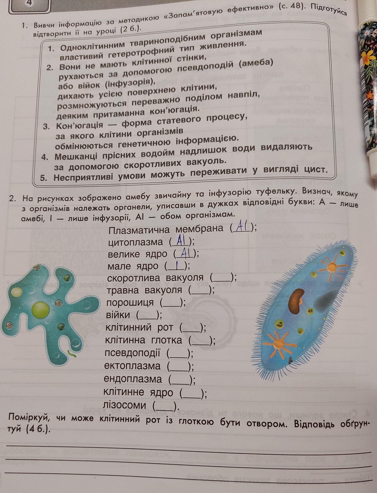 2. На рисунках зображено амебу звичайну та інфузорію туфельку. Визнач, якому з організмів належать органели, уписавши в дужках вiдповiднi букви: А - лише амебі, 1 — лише інфузорії, Al - обом організмам. - Плазматична мембрана ( цитоплазма без велике ядро (); мале ядро ( ); зостіді скоротлива вакуоля ( ); травна вакуоля (); порошиця ( ); війки (); клітинний рот (); клітинна глотка (____); псевдоподії ( ); ектоплазма ендоплазма клітинне ядро ( _____ ); лізосоми.