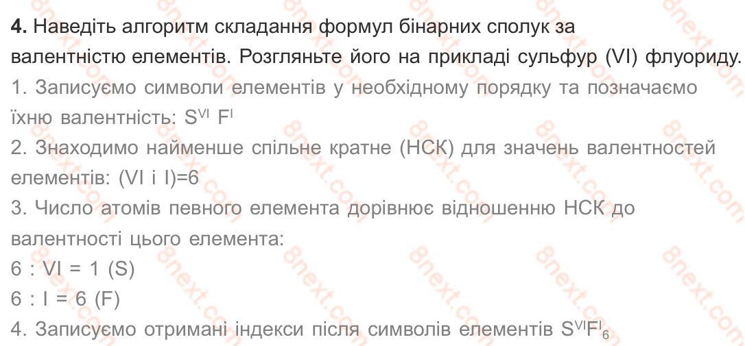 Ответ:1. Записуємо символи елементів у необхідному порядку та позначаємо їхню валентність: SVІ FI2. Знаходимо найменше спільне кратне (НСК) для значень валентностей елементів: (VI і I)=63. Число атомів певного елемента дорівнює відношенню НСК до валентності цього елемента:6 : VI = 1 (S)6 : I = 6 (F)4. Записуємо отримані індекси після символів елементів SVIFI6