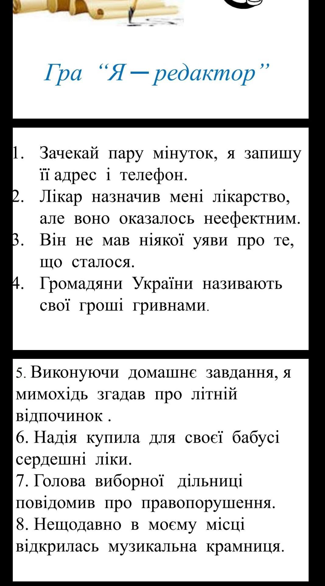 1. мінуток - хвилинок/хвилин, 2. оказалось - виявилось, 3. він не мав ніякої уяви - він не мав й думки, 4. гривнами - гривнями, 6. сердешні ліки - ліки для серця, 7. голова - очолювач, 8. відкрилась - відчинилась