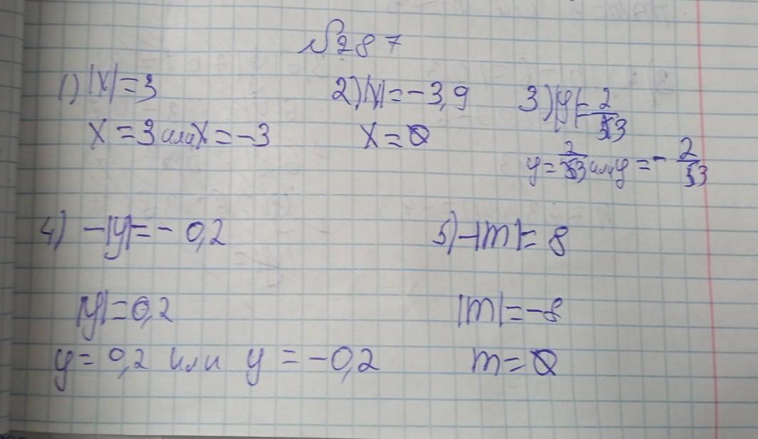 287. Решите уравнения: 1) |x| = 3; 3) y 5) -|m| = 8; 2) |x| = -3,9; 4) -y = -0,2; 6) |-|- 6; 288. Решта 2 7) --* = -0,9; 8) - x = -7. 5) [m/. Помогите пж дам много балов