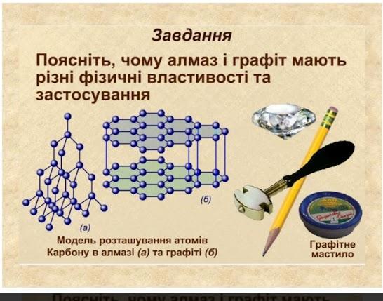 Пояснення: Алмаз за будовою має форму ( де атоми карбону розташовані в кутах правильного тетраедра. Завдяки такому розташуванню атомів вуглецю всі зв'язки рівні (ковалентні), а відстані між атомами однакові. Саме така будова і робить алмаз таким твердим, що дозволяє використовувати його міць в різних галузях де це потрібно. А у графіта атоми карбону розташовані "слоями" тобто один на одному і відстань між атомати різна, саме тому коли олівець пише нижні шари відшулухуються та залишають слід на папері.