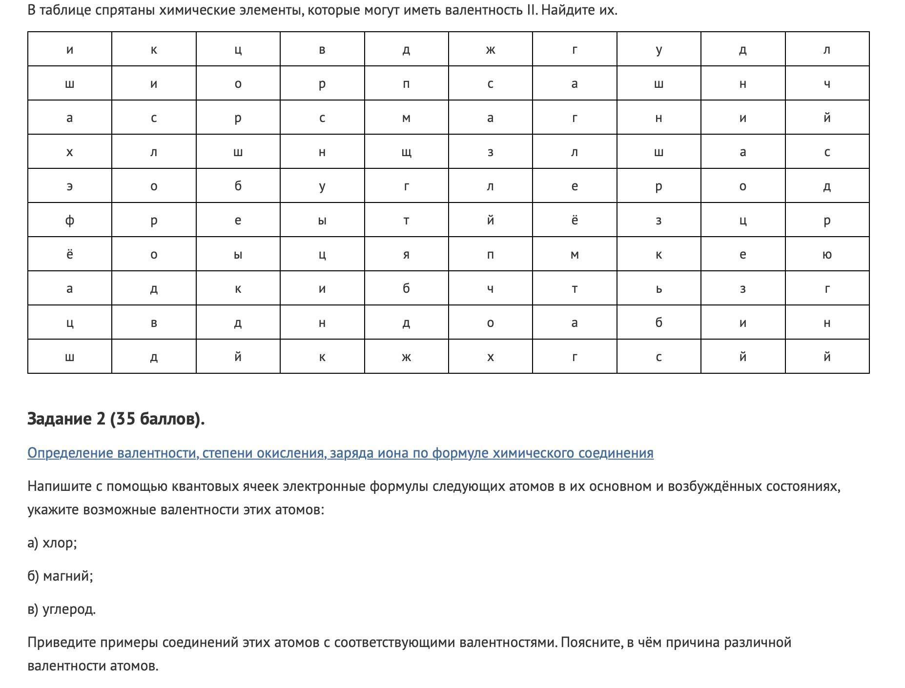 В таблице спрятаны химические элементы, которые могут иметь валентность II. Найдите их.