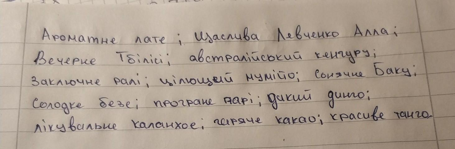Ароматн.. лате; щаслив.. Левченк.. Алла; вечерн.. Тбілісі; австралійськ.. кенгуру; заключн.. ралі; цілющ.. мумійо; сонячн.. Баку; солодк.. безе; програн.. парі; дик.. динго; лікувальн.. каланхое; гаряч.. какао; красив.. танго.