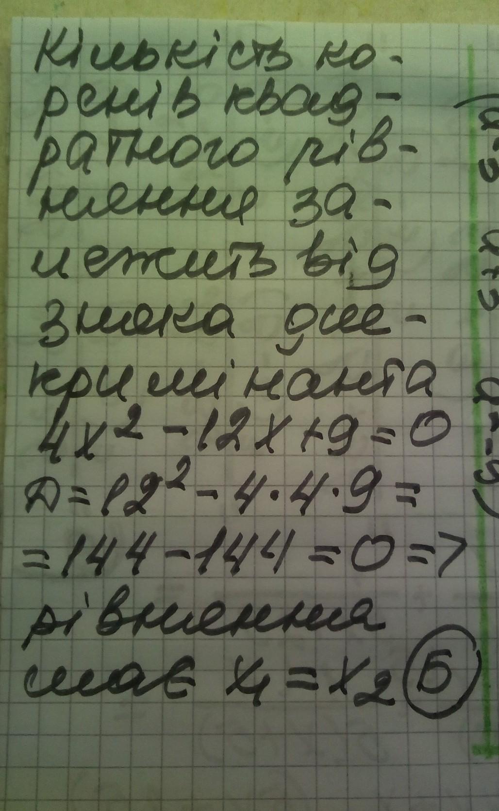 3. Скільки коренів має рiвняння 4х² -12x+9=0? A два Б один B Безліч коренів Г Жодного кореня​