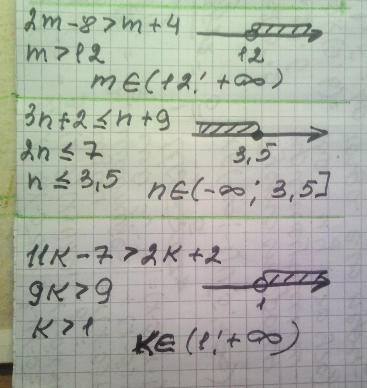 Решите неравенство и изобразите множество его решений на координатной прямой: 13) 2m-8>m+4 14) 3n+2 ≤n+9 15) 11k-7>2k+2.