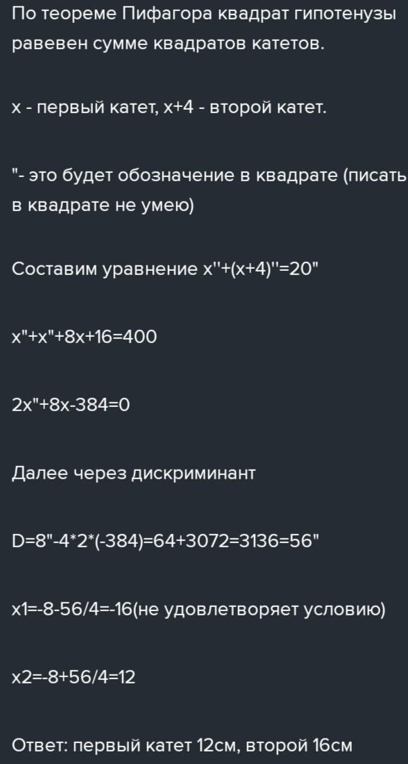 Гипотенуза прямоуоольного треугольник равна 20 см. Найдите его катеты, есди один из них на 4 см больше другого.