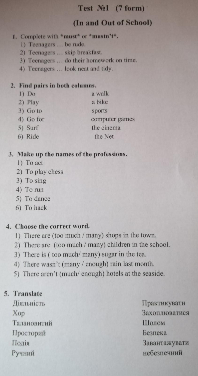 Контрольна робота з англійської мови 7 клас test & 1 (in and out of school)