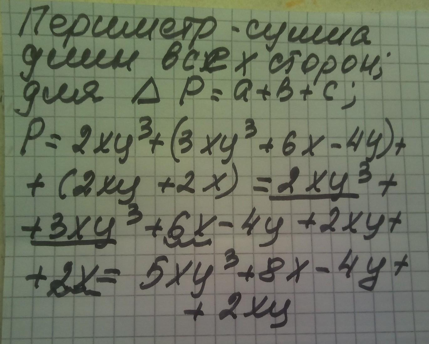 найдите периметр треугольника если его стороны выражены многочленами а=2ху³, б = 3 ху³ + 6х -4у, с= 2 Ху + 2х