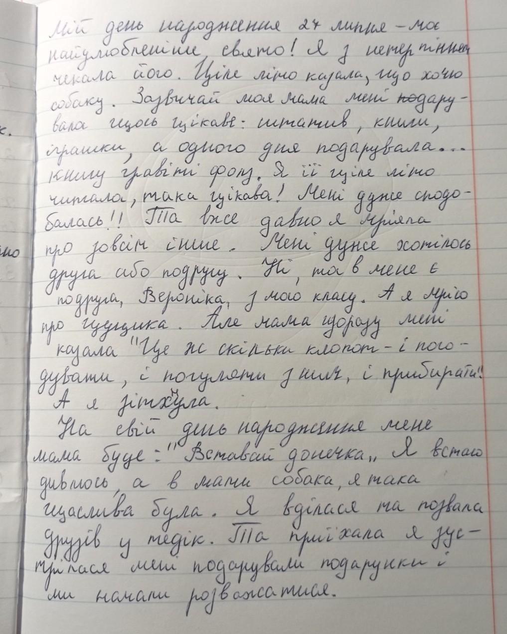 Мій день народження - найособливіший день для мене. Я святкую свій день народження : ___ (Число) ___ (Місяць) На свій день народження, я хочу багато грошей, іграшок, та всього іншого. Коли от от мої батьки відкриють двері, та тихо розбудять, скажуть: "З ДНЁМ НАРОДЖЕННЯ, ДОНЮ!" Для мене, це дуже приємно, та несподіарнно. Я хочу святкувати свій день народження у парку, щоб побачити чудових тварин. У вечері, ми з батьками куштуєма торта, мене ще раз вітають, бажають успіхів, грошей, і тд. Я лягаю спати, та тихо-тихо засинаю, цей день народження, дуже швидко минув, але все одно, дякую вам, батьки!