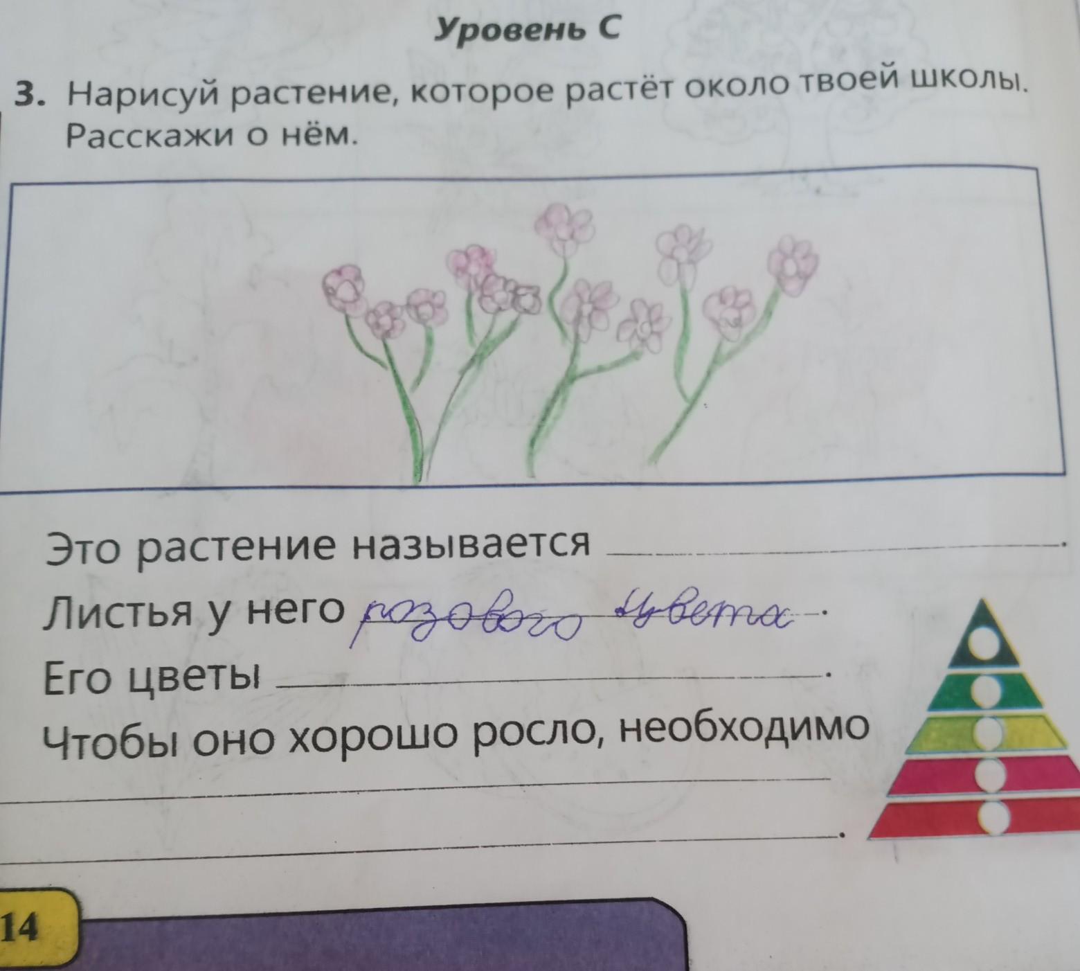 Уровень С 3. Нарисуй растение, которое растёт около твоей школы. Расскажи о нём. правови Это растение называется Листья у него Его цветы Чтобы оно хорошо росло, необходимо