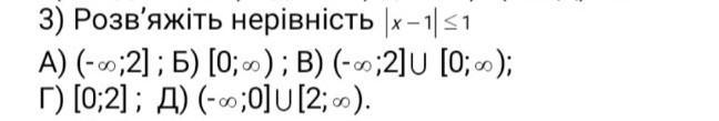3) Розв'яжіть нерівність (x-1| 51 A) (-∞;2] ; Б) [0;) ; B) (-∞;2]U [0; ∞ ); Г) [0;2] ; Д) (-∞;0]U[2; ∞).