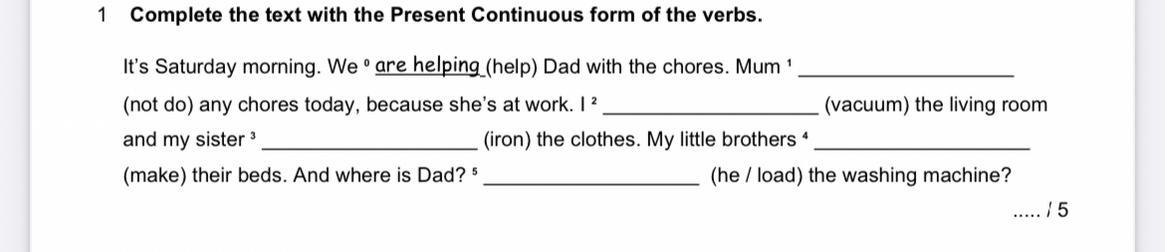 1. mom isn't doing any choices today because she's at work. I am vacuuming the living room and my sister is ironing the clothes. my little brother's are making their beds. and where is dad? is he loading that washing machine?