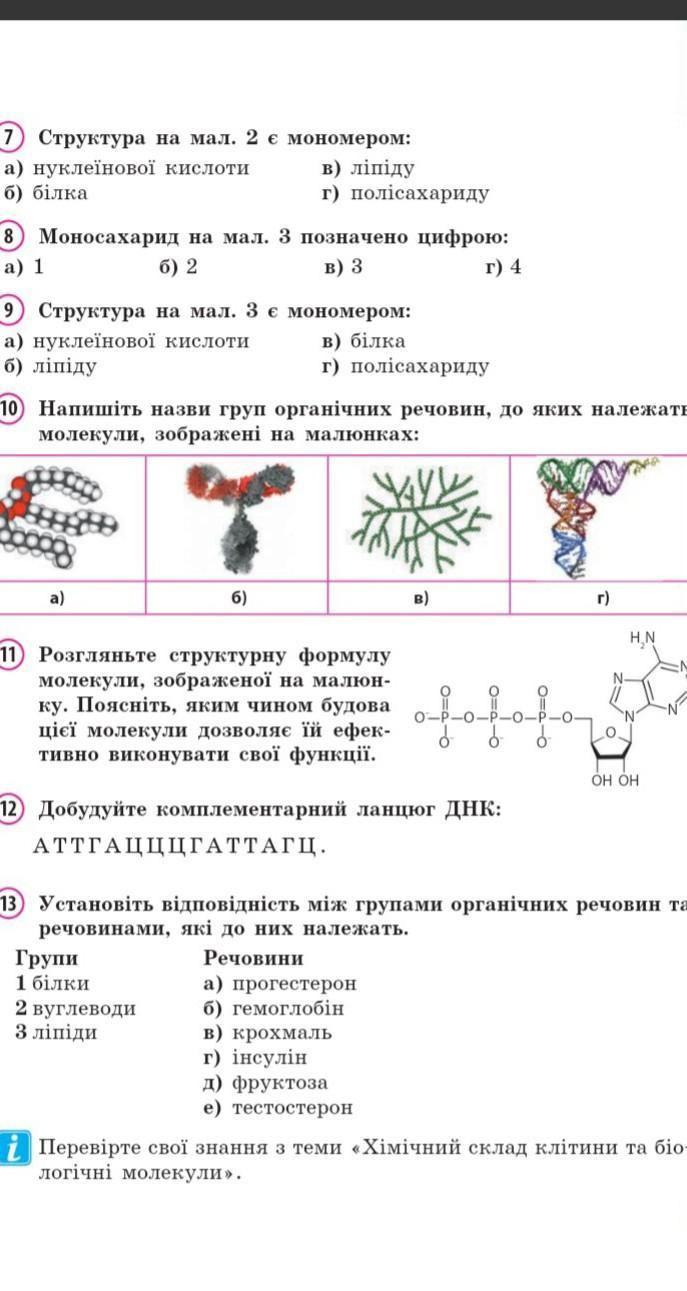 11. Це мономер РНК - АТФ. Складається з пентози(рибози), нітрогеновмісних основ і трохи залишків ортофосфатної кислоти. Зв'язки між цими ортофосфатними кислотами називаються макроергічними, тому при їх розриві вивільняється енергія. Наприклад АТФ перетворюється в АДФ, а АДФ в АМФ.