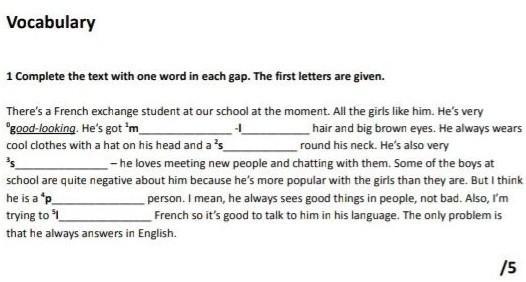 Vocabulary 1 Complete the text with one word in each gap. The first letters are given. There's a French exchange student at our school at the moment. All the girls like him. He's very "good-looking. He's got 'm_ hair and big brown eyes. He always wears round his neck. He's also very cool clothes with a hat on his head and a 's - he loves meeting new people and chatting with them. Some of the boys at school are quite negative about him because he's more popular with the girls than they are. But I think he is a 'p trying to $1 that he always answers in English. person. I mean, he always sees good things in people, not bad. Also, I'm French so it's good to talk to him in his language. The only problem is /5