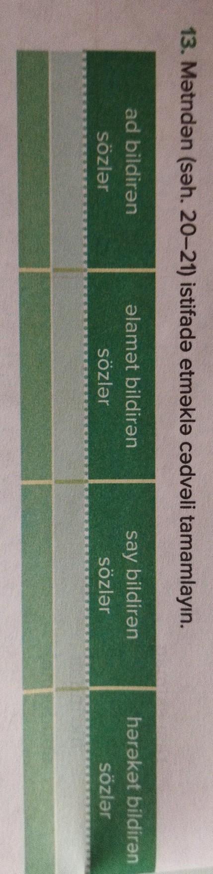 13. Mətndən (səh. 20-21) istifadə etməklə cədvəli tamamlayın.Помогите срочно даю 50 баллов